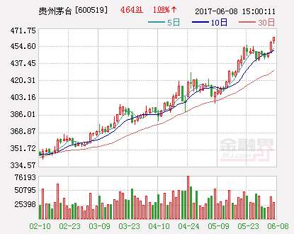 - 2017年6月8日周三早盘,贵州茅台(600519)再度迎来上涨,盘中创出460元/股的新高。截至发稿时,贵州茅台上涨1.57%,报455.9元/股。按照贵州茅台新高价计算,贵州茅台市值已接近5800亿元。分析人士认为,有五个原因是茅台价格上涨的核心因素:茅台酒2017年全年的供给计划为2.68万吨,全年将呈现紧平衡的情况。根据茅台党委书记李保芳在3月经销商会议上的发言,上半年茅台的供给量约在1.3万吨,下半年1....