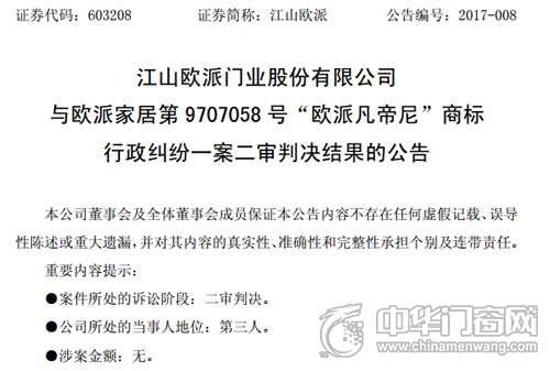 - 2017年6月5日【中华门窗网】自江山欧派门业有限公司与欧派家居集团股份有限公司因商标问题引发诉讼案件以来,便引发了业界的持续关注。近日,两家“欧派”的商标纠纷案有了最新进展。2017年2月17日,江山欧派门业股份有限公司收到了北京市高级人民法院的行政判决书,判决结果显示:欧派家居公司的上诉理由不成立,驳回上诉,维持原判。具体有关情况如下:两家“欧派”商标纠纷案新进展:江山欧派门业二审胜诉(图片来源网络)2015年...