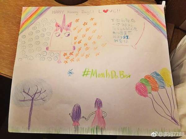 - 2017年6月2日5月14日母亲节,黄磊老婆孙莉通过微博晒出女儿多多送给自己的一幅画作,配文道“下完雨都有一个彩虹,而妈妈就是我最美丽的彩虹。谢谢你,宝贝!”画作中,多多画了自己和妈妈手牵着手,还写有“LOVE”等字样,非常暖心。见到多多亲手绘画送给妈妈作为节日礼物,网友纷纷留言感叹“幸福的多妈可爱的多多”“多多好暖”“多妈有这么乖巧的女儿,好幸福”。...