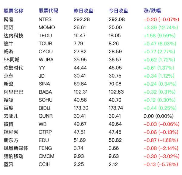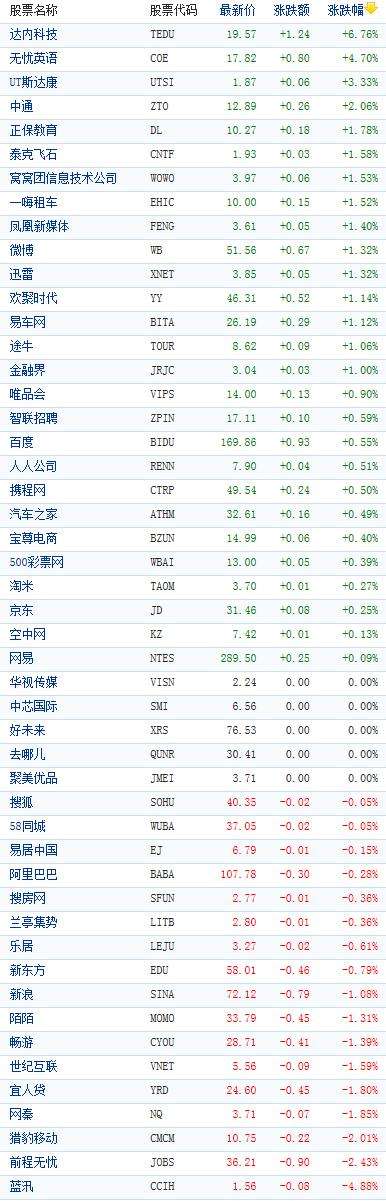 - 2017年6月2日金融界美股讯:北京时间3月29日凌晨消息,周二美股低开高走,道指攀升0.73%,从而结束了八连跌的颓势,能源和金融板块领涨。美国消费者信心指数创下16年新高,提振了市场情绪。中国概念股周二收盘涨跌互现,百度(美股BIDU)上涨0.55%报收169.86美元,京东(美股JD)上涨0.25%报收31.46美元,阿里巴巴(美股BABA)下跌0.28%报收107.78美元;四只股票涨幅超2%,其中达内科技...
