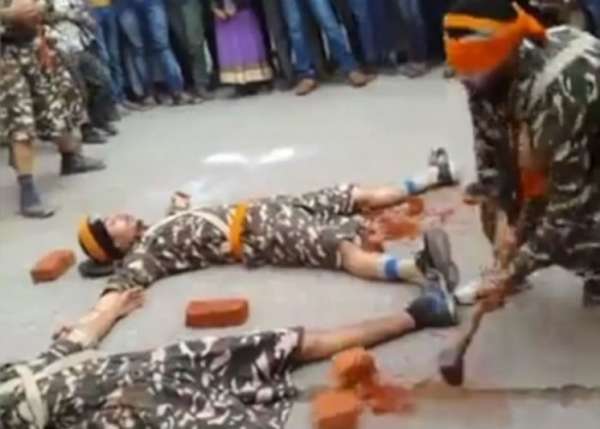 - 2017年5月31日印度男子躺在地上,亡命演出。拿锤子的男子被蒙着眼睛。网上近日流传一段惊心动魄的片段,印度3名男子躺在地上,一名被蒙眼的男子拿着大锤,一下一下地击碎放在地上的砖头。从影片可见,3名身穿战士服饰的男子躺在地上,头部前方和四肢附近分别摆放了一块砖头,一名蒙眼男子在旁人指挥下走近他们,然后举起手中的大锤,击碎砖头,差点击中其中一名男子的腿,十分惊险。...