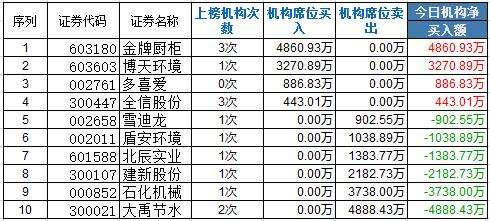 - 2017年5月31日1、今日机构龙虎榜上榜12只个股,净买入4只,净卖出8只,总买入额8608万,总卖出额1.43亿。2、当日机构买入最多的个股前三分别是金牌橱柜(4860万)、博天环境(3270万)。1)金牌橱柜:三家机构买入,前买五合计占比15.57%,前卖五合计占比8.85%。连续三日获得机构买入加仓,到昨天为止是1.03亿,加上今天的,总共超过1.5亿。今天低开又被机构拉回来了,到目前龙虎榜还没有机构卖出,昨...