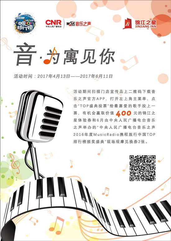 - 2017年5月29日日前,由中央人民广播电台主办、中央人民广播电台音乐节目中心承办的2016年度“MusicRadio携程旅行中国TOP排行榜颁奖盛典”启动记者会在北京明星基地举行,现场揭晓了“年度最受欢迎系列”部分入围奖项,开启了歌迷投票通道。锦江之星积极助阵票选,推出了“音·为寓见你”主题活动,为广大歌迷带来惊喜福利。4月13日起至6月11日前往全国任一锦江之星连锁酒店,扫描前台二维码,下载“音乐之声”官方APP...