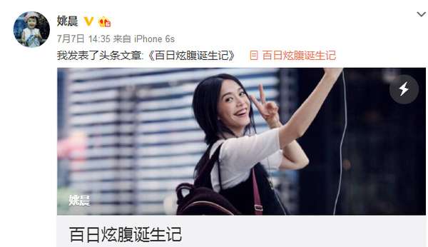 - 2017年5月27日中新网7月8日电昨日,姚晨在微博中发表长文《百日炫腹诞生记》,还附上了一张怀孕期间的美照。文中称,自己首次怀孕时担心身材走样,拿肥大的孕妇装遮丑,现在怀二胎想做时髦孕妇,将“炫腹”100天!姚晨与摄影师曹郁结婚后生下儿子小土豆,如今再喜怀二胎,经常在微博中晒孕期美照,丝毫不担心怀孕影响外貌身材,展现出自信。记得我第一次怀孕,每天最惶恐的事情,就是看到肚子渐渐隆起象只青蛙,曾引以为傲的身体曲线变得古...
