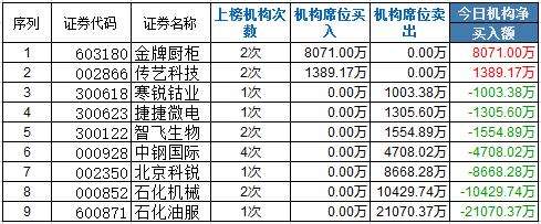 - 2017年5月27日机构追踪(机构操作比较少,机构马甲操作两次新股!)金牌橱柜为开板次新股,两机构席位介入8071万,并且东川路介入2993万,并且荣超也有介入,一般情况下东川路的营业部都会有机构马甲席位,以此判断介入机构席位可能是游资马甲席位概率较高。传艺科技(行情002866,诊股)同样也是次新股,两机构席位介入1389万,应该是短线机构席位买入。石化油服(行情600871,诊股)为油改概念股,今日强势涨停,机构...