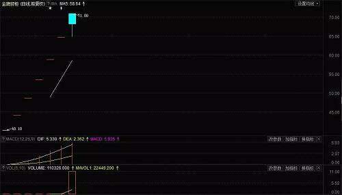 - 2017年5月27日新浪财经App:直播上线博主一对一指导新股金牌厨柜(603180)今日首次打开一字涨停板,截止(09:26),最新报价为71.00元,较发行价上涨154.94%。该股5月12日上市,首日如期上涨44%之外,随后连获5个一字涨停板。金牌厨柜发行价27.85元,发行市盈率22.99倍,其中网上发行1700.00万股。公司主营业务为1、经营本企业自产产品的出口业务和本企业所需的机械设备、零配件、原辅材料...