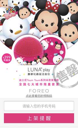 - 2017年5月19日(原标题:网红洗脸仪ForeoLunaPlay迪士尼限量款)作为洗脸仪中的爆款网红,FOREOLUNAPLAYDisney联名限量款洗脸仪上架不足一天,就被真爱粉们抢光了。剩下的拥趸者刷了几次页面无果终于接受残酷的现实,FOREO中国区微博下面一边是抢到FOREOLUNAPLAYDisney的兴高采烈,一边是没抢到的哀鸿遍野。一款洗脸仪的预售居然也能这么疯狂?在一些人还不知道洗脸仪是什么东西的时候...