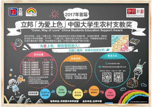- 2017年5月16日2017年立邦携手中国大学生社会实践知行促进计划”(简称“知行计划”)启动「为爱上色」中国大学生农村支教奖(简称“支教奖”)高校征集,“支教奖”作为“知行计划”核心项目,结合“一带一路”和“精准扶贫”国家战略,组织50所高校100支大学生团队开展乡村支教及建筑遗产调研活动,并将根据调查成果形成《中国乡村建筑遗产保护名录》,记录乡村建筑遗产的历史和现状,鼓励大学生为乡村文化保护及经济发展建言献策,助...