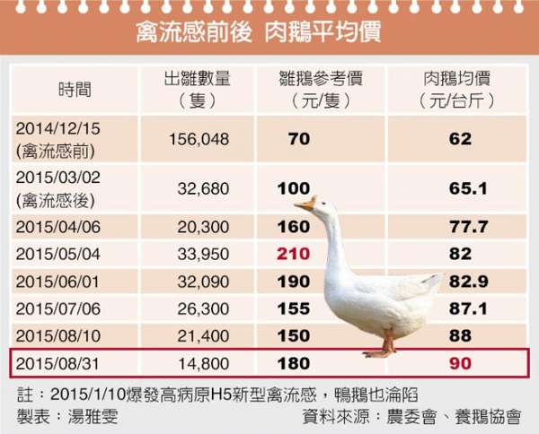 - 2017年5月13日禽流感前后肉鹅平均价禽流感肆虐,造成市面没有鹅肉贩售,不少鹅肉店「挂鹅头卖鸭肉」以维持生意;如今鸭成为年底新一波禽流感目标,姜母鸭业者「剉咧等」,期盼老天保庇别让禽流感「鸭」垮一切。根据农委会统计,全台鹅场总共971场,总在养量约177万只,年初爆发新型禽流感,云林养鹅业几乎惨遭「灭顶」,不少鹅肉店没有鹅肉卖,业界预估2年后,国内肉鹅產业才能正常供应。全台鸭场约2381场,总在养量约732万600...
