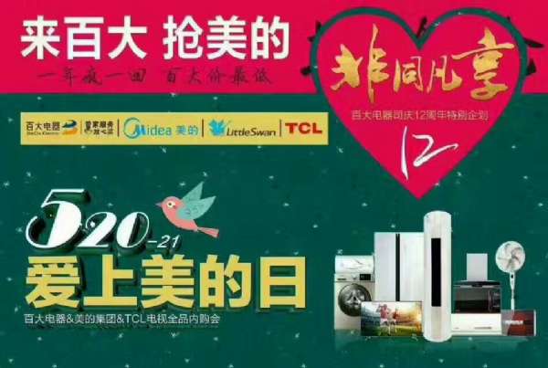 - 2017年5月13日爱一人倾一城,爱不但要说出来,更要用行动来证明,5月20-21日520爱上美的日\u00A0【百大电器蚌埠百货大楼六搂家电】美的全产品&TCL电视全品内购会!与您相约呦!...