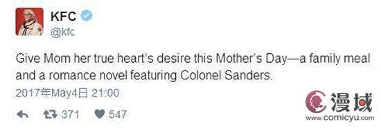 - 2017年5月8日美国知名的快餐连锁品牌肯德基的官方推特在5月4日发文表示:“在这个母亲节给妈妈送上她心中真正渴望的东西——一顿家庭餐和一个山德士上校主演的浪漫小说。”随后在美国亚马逊也上线了一部名为《欲望的娇柔翅膀(原名:TenderWingsofDesire)》小说。小说封面中可以看到一头白发戴着眼镜的肯德基创始人哈兰·山德士爷爷穿着无袖的衣服,露出强健的手臂,并用公主抱着一位年轻的女性,在左下角还能看到一桶肯...