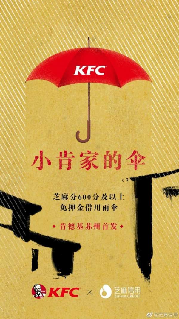- 2017年5月8日(原标题:芝麻分600分以上又一福利:可到肯德基免费借伞)除了可免押金骑共享单车之外,蚂蚁金服今日又宣布一项福利:芝麻信用分超过600分以上,下雨天就可以找肯德基免押金借伞了。据了解,此次福利为肯德基苏州首发,未来有望推广到其它各地。去年,芝麻信用推出了各种信用借还服务,包括充电宝、雨伞、玩具、境外Wi-Fi、数码、服装等。支付宝进入“芝麻信用”――“信用借还”即可查看。借东西的时候,先找到该地区...