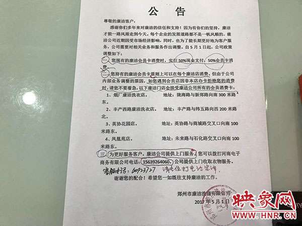 - 2017年5月6日(原标题:郑州康洁洗衣店凭卡消费仍需付现公司:资金链紧张)映象网快讯(记者王邵怡文/图)5月2日,市民贠女士向映象网反映,她在郑州康洁洗衣店办了洗衣卡,但这次去洗衣服发现用卡政策跟以前有变化,洗衣结账需要一半刷卡一半付现,而以前仅刷卡就可以结账。顾客:办卡后结账仍需付现洗衣卡不能全市通用贠女士说自己经常在康洁洗衣服,想着是知名品牌就办理了1000元的储值卡,办卡时门店告诉她,以后洗衣服就用这张卡结...