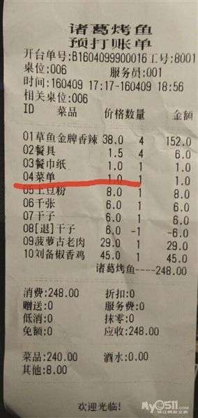 - 2017年5月3日打印的“点菜单”也要收费。网友供图上个星期六,镇江市民马先生来到镇江城区大市口新开张的诸葛烤鱼店吃饭,本来家庭小聚、其乐融融,可最后结账的时候,马先生却发现了一件堵心的事儿,收费清单上一一列出了消费菜品的详细价格,可是仔细查看后却发现,点菜单也要收费,一张菜单收一块钱,这让马先生感到非常的惊讶,从来没听说过点菜单还要收费这样的怪事。通讯员潘宇琴“点菜单”也要收费,闻所未闻4月9日,镇江市民马先生带...