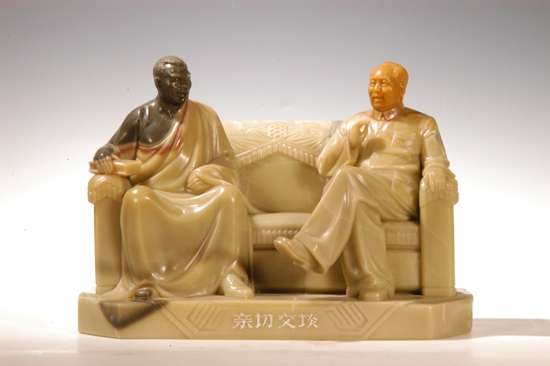 - 2017年4月29日这件作品是杨楚照先生的一件完美作品。作品展示的是毛泽东主席会见加纳总统恩克鲁玛的真实历史场景。作者将二位元首安排在同一沙发上亲切交谈,主题明确,布局合理,构思巧妙,人物坐姿和动作符合各自的身份,稳重而大气。人物距离安排得恰到好处,再远就不亲切,再近就无尊严。作品俏色精美,加纳总统的脸部和肩膀露出的皮肤为三彩原石的黑色部分雕刻而成,青白色石材雕刻成身披的长袍,线条流畅,形象生动逼真。金黄色石材雕刻为...
