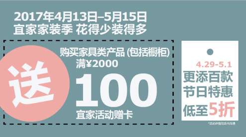 - 2017年4月28日5.1节小长假马上到了!宜家专门为留守家里搞装修、买家具、定橱柜的好同志们送福利了!即日起至5月15日“宜家家装季”优惠大放价!全场家具产品(含橱柜)满¥2000送¥100活动赠卡,多买多送,花得少装得多!五一假期3天更添百款节日特惠低至5折起!赶紧去宜家一站式购齐新居所需,实惠又省心!同时,集高品质、功能强大和性价比高于一体的宜家厨柜也全线参加装修季优惠,除了拥有高达25年品质保证外,各种设计新...