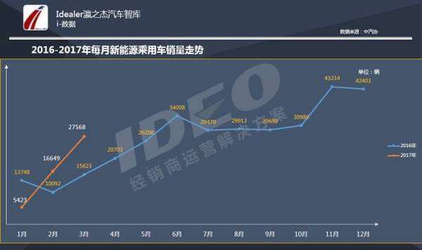 - 2017年4月28日2017年3月新能源乘用车销量日前,根据乘联会厂家数据,2017年3月新能源乘用车销量达2.76万,环比2月增长66%,同比增长77%,新能源乘用车市场继续向好。从1月份0.54万辆的惨淡,到2月份1.66万辆的稍有恢复,3月份的2.76万辆可以说已经回归正常,政策的风波已经淡去。其中,纯电动乘用车销售22953台,占比83.3%,同比增长117%,环比增长72%;插电式混合动力乘用车销售4615...