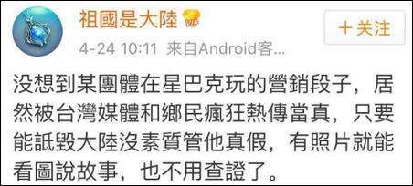 - 2017年4月27日原标题:星巴克地球日免费喝咖啡大陆恶搞图片台湾网友也当真了[文/观察者网高雪滢]上次卡尔文森号航母“去朝鲜”,我们已经开始辟谣了,台湾媒体还在报道“美国航母威胁朝鲜半岛安危”。尴尬的是,这一情况迅速重演……4月24日,网友@祖国是大陆在微博爆料,某团体在星巴克玩的营销段子,被部分台湾网友当真了,疯狂传播。据说星巴克22日地球日做活动,自带容器即可免费喝咖啡,于是出现了这一幕:被营销号一转,大家开始...