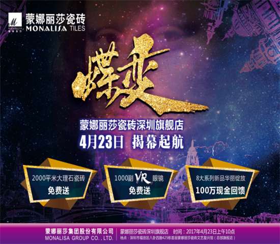 - 2017年4月25日2017年4月2日-23日深圳福田区八卦四路2000㎡蒙娜丽莎瓷砖旗舰店蝶变起航,值此展厅重装试业之际,深圳蒙娜丽莎瓷砖广邀新老客户各界同仁参观指导。在试业期间凡报名参加即可获赠品牌VR眼镜一副,沉浸式VR家装体验。下订金满1000元即可获赠5㎡大理石瓷砖!精明的你不容错过。为支持深圳旗舰店重装试业,蒙娜丽莎集团总部特供工厂直供新品,原价168元/片的800*800全抛釉瓷砖在4月23日只要46....
