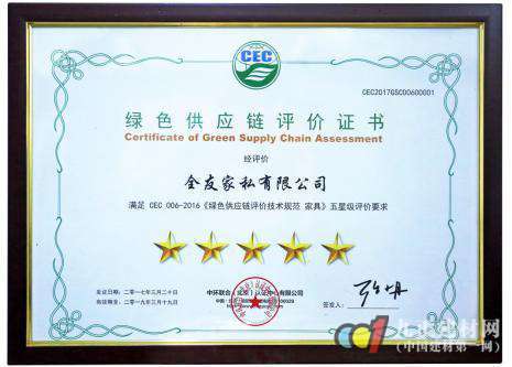 - 2017年4月24日2017年3月21日,经环境保护部批准,由中环联合认证中心(CEC)、深圳市家具协会主办的“供给侧结构性改革与绿色供应链管理创新研讨会”在深圳召开。中国家居行业领军品牌全友家居凭借行业领先的“全流程绿色供应链”成为国内首批荣获“绿色供应链五星认证”企业。据悉,此次绿色供应链认证五星评定是由主办单位通过初选和现场评价等环节严格评选产生的。在初选环节,主办单位主要对候选企业的规模、品牌影响力、品质、绿...