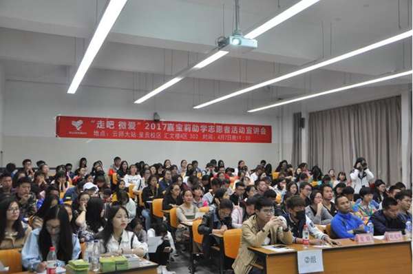 - 2017年4月24日4月7日,“走吧微爱”嘉宝莉助学志愿者活动第五次走进云南师范大学,五年助学招募,嘉宝莉“走吧微爱”活动早已与云南师范大学莘莘学子结下了不解之缘。从前期招募宣传吸引了300多名学子前来报名,到当天晚上熟悉的汇文楼宣讲会现场座无虚席,“走吧微爱”已不单纯是一个熟悉的名字,而这个活动,早已成为了众多怀抱公益之心的学子,走向大山,给贫困孩子送去希望之光,送去微微大爱的光明大道。“走吧微爱”嘉宝莉助学志愿者...