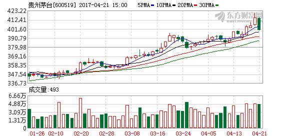 - 2017年4月22日号外财经讯4月21日,贵州茅台(600519)盘中虽创出新高,但最终股价深跌。号外财经注意到,贵州茅台在4月21日午后震荡走低,全日收跌3.56%,收报400.53元。该股昨日最高攀升至420.43点,再度刷新历史新高。港交所盘后数据显示,沪股通当日卖出贵州茅台3.75亿元,净卖出额为2.73亿元。值得注意的是,4月18日,沪股通亦净卖出4.34亿元贵州茅台,当日该股站上400元大关。号外财经观察...