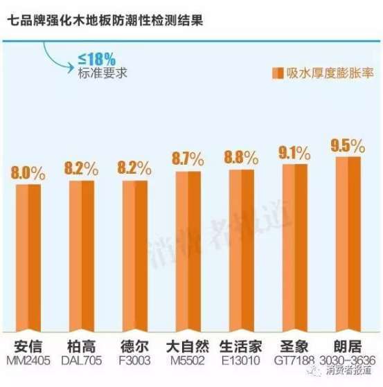 - 2017年4月22日《消费者报道》委托第三方权威机构对地板行业七个品牌的强化地板样品进行“吸水厚度膨胀率”检测。结果显示,安信地板吸水膨胀率为8%,优于国家推荐性标准《浸渍纸层压木质地板》中“吸水厚度膨胀率小于18%”的标准,成为参与检测的品牌中吸水膨胀率表现最优的品牌。且甲醛释放量为0.2mg/l,远优于国家E1级(1.5mg/l)标准,甚至比行业E0级标准还要优秀(0.5mg/l)。图注:数值越低,表明防潮性越好...
