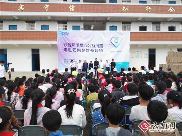 - 2017年4月11日4月7日下午,欧普照明新农村房屋灯光改造暨爱心公益捐赠仪式在楚雄彝族自治州楚雄市苍岭镇西云完小举行。在此次捐赠活动中,楚雄市苍岭镇358户870名贫困群众和1457名在校学生收到了欧普照明捐助的灯管、灯泡、吸顶灯、台灯等总价值近63万人民币的7725个灯具。在捐赠现场,苍岭镇西云村委会席草坝村小组村民王景春领到灯具时激动地说,“有党委政府和爱心企业的关心,我们有信心早日脱贫!”西云完小六年级的学生...