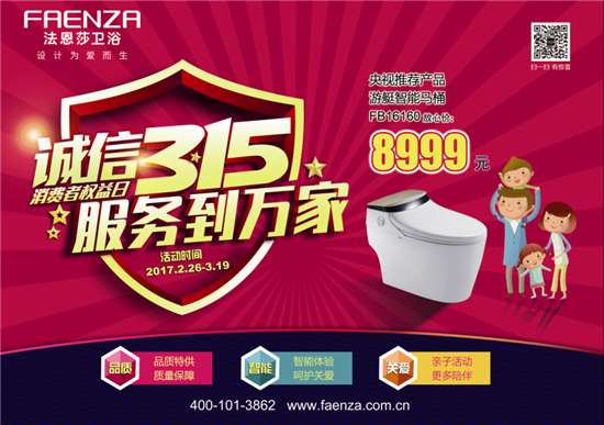 - 2017年4月10日一年一度的315如约而至,3.15在消费者心目中与产品品质,诚信相挂钩。产品的品质不仅仅关乎产品质量,更关乎家人的产品体验和安全,好的产品体验能够让家人使用更加舒心,更加便捷。法恩莎卫浴,秉承设计为爱而生的设计理念,为了让每个消费者都能使用有爱的卫浴产品,也为了让消费者更加信任法恩莎卫浴的品牌品质,特此,在315之际法恩莎卫浴向广大消费者直接让利,给到消费者最贴心的购买理由,让每个消费者在起床之后...