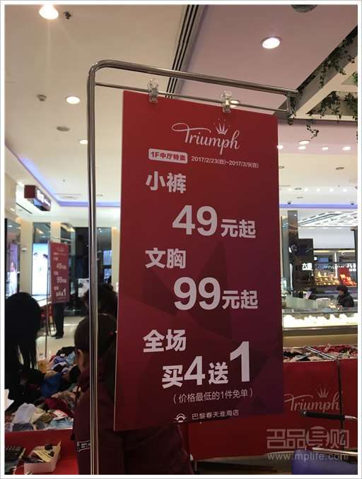 - 2017年4月8日黛安芬Triumph是德国著名的内衣品牌,以其流行的设计、精巧的做工、舒适的感觉、先进的面料,赢得了全世界女性的青睐。此次黛安芬在巴黎春天淮海店1楼举行的特卖,全场49元起,文胸119元,还有买4送1的折上折优惠哦!这次还有旗下少女内衣系列参加!喜欢的朋友们可以去现场看看哦!黛安芬内衣春季特卖实拍黛安芬内衣春季特卖实拍黛安芬内衣春季特卖实拍...