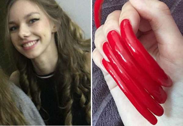 - 2017年4月7日据英国《每日邮报》4月4日报道,德国16岁的学生西蒙?泰勒(SimonTaylor)上次剪指甲已经是2014年的事了,2015年5月她在照片分享软件Instagram上分享了她指甲的照片,俘获了很多粉丝。现在她的指甲已经有6英寸(约15.2厘米)长,可是最近考试时没法握住钢笔让她很痛苦。她表示,起初自己不是有意要留这么长的指甲,她每天都对自己说明天一定要剪指甲,可是第二天又打消了念头,后来称赞她指...
