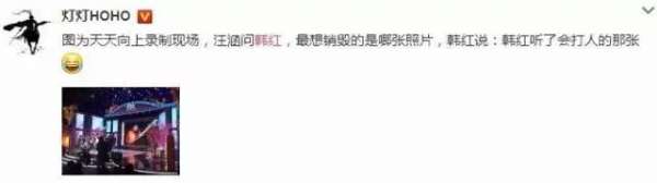 - 2017年4月5日最近有人爆料韩红录制《天天向上》时,被汪涵问:最想销毁的是哪张照片?韩红说:韩红听了会打人的那张。于是大屏幕上立刻出现了这张照片↓这回答简直笑炸!接着评论区瞬间沦陷。大家纷纷表示:戳开这条微博评论简直笑到窒息好吗好担心自己会在睡梦中暴毙啊哈哈哈其实这些很多都是韩红在公益活动中的照片,虽然配上文字变成表情包很搞笑,但她为公益事业做得贡献还是很值的赞扬的。...