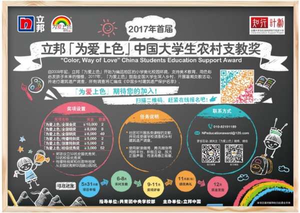 - 2017年4月1日原标题:立邦加入知行计划助力1,000+大学生为村镇发展建言献策——2017立邦「为爱上色」中国大学生农村支教奖正式启动2017年立邦携手中国大学生社会实践知行促进计划”(简称“知行计划”)启动「为爱上色」中国大学生农村支教奖(简称“支教奖”)高校征集,“支教奖”作为“知行计划”核心项目,结合“一带一路”和“精准扶贫”国家战略,组织50所高校100支大学生团队开展乡村支教及建筑遗产调研活动,并将根...