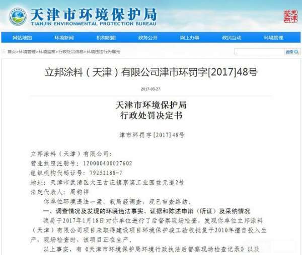 - 2017年4月1日3月27日,天津市环境保护局(下称“天津环保局”)向立邦涂料(天津)有限公司(下称“天津立邦”)发出行政处罚决定书(津市环罚字[2017]48号),责令天津立邦建设项目停止生产,并处人民币4万元罚款。处罚决定书指出,天津立邦被处罚的原因是:“天津环保局于2017年1月18日对天津立邦进行了后督察现场检查,发现天津立邦项目未取得建设项目环境保护竣工验收批复于2010年擅自投入生产,现场检查时,该项目...