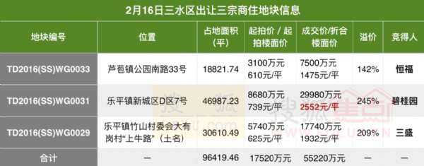 - 2017年3月31日佛山搜狐焦点讯\u00A02月16日,三水区一口气出让三宗商住地,地块分别位于乐平镇、芦苞镇两镇街,虽然地块并非在中心区域,但却均以高溢价成交。其中,碧桂园以29980万元竞得三水乐平新城地块,溢价245%,折合2552元/平米;三盛地产以17740万元竞得乐平“上牛路”地块,折合楼面价1932元/平米,溢价209%;恒福则以7500万元竞得三水芦苞镇地块,折合楼面价1475元/平米,溢价142%...