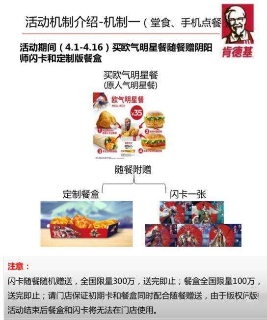 - 2017年3月29日阴阳师现已加入肯德基豪华午餐,下面带来4月份的肯德基最新活动,包括了阴阳师限量闪卡和定制版餐盒,下面来看看分别有哪些活动奖励和答疑。4月1日-16日活动,购买欧气明星餐(价格未知),附赠定制餐盒和闪卡一张.闪卡:一张有阴阳师式神图鉴的卡,包含现世召唤符咒(100%中奖,随机1、2、3、5、7张)boss团:LBS地图活动,击败获取奖励。目前肯德基已经放上了阴阳师的式神,包括了:妖琴师、青坊主、荒、...