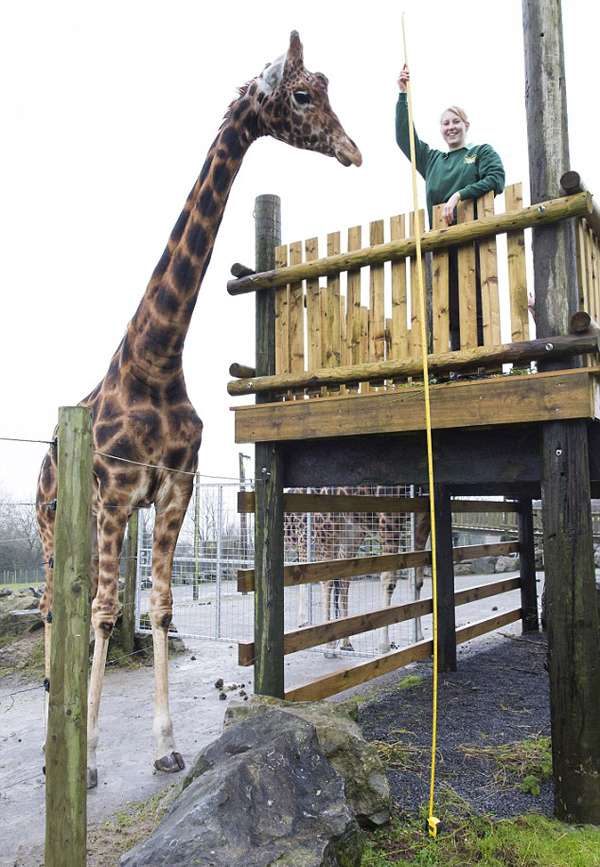 - 2017年3月28日据英国《每日邮报》1月4日报道,英国威尔士彭布罗克郡一家动物园内的一只长颈鹿,身高达5.8米,超出长颈鹿平均身高1.2米,有可能成为世界上最高的长颈鹿。18岁大的长颈鹿祖鲁现住在英国彭布罗克郡一家农场动物园,5.8米的身高使它成为农场中最高的动物。由于祖鲁体重达1.3吨,他高大的身躯使得饲养员无法确切测量其身高。目前已知的9种长颈鹿的平均身高约为4.6米,因此许多动物专家和饲养员猜测,祖鲁可能是目...