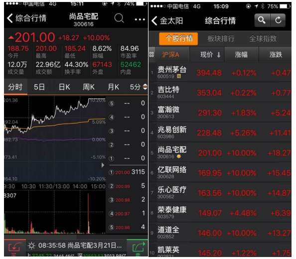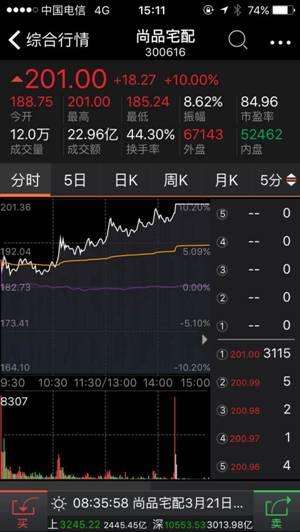 - 2017年3月27日2017年3月7日,尚品宅配在深交所创业板正式挂牌上市。作为A股市场的新秀,尚品宅配近期在资本市场上表现亮眼。经历连续9个涨停后,3月20日受大市波动影响,尚品宅配股价首次开板终结连续一字涨停的走势,但随后在3月22日的交易日收复失地,尚品宅配股价早市高开188.75元随大市小幅度波动后快速回封突破200元,最新报收201元,单日涨幅10%,总体股价排名位列前五位进入A股“第一梯队”,公司总市值攀...