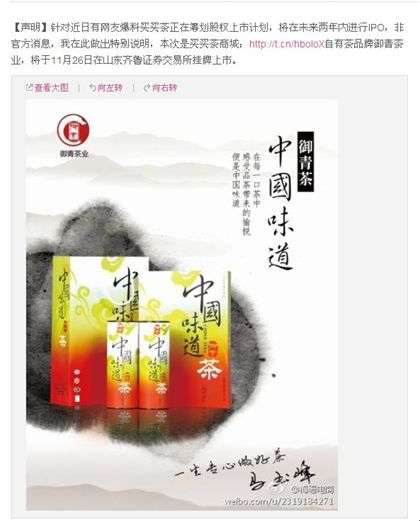 - 2017年3月22日针对近日网友爆料“买买茶正在筹划股权上市计划,将在未来两年内进行IPO”一事,今日,华夏茶联集团高级副总裁,兼任买买茶商城品牌市场事业部总经理对此事件正式做出回应。梅珊表示,目前谈论买买茶上市还为时尚早,上市是真而非买买茶。即将上市的是买买茶自有茶品牌御青茶业,其将于11月26日在齐鲁股权托管交易中心。御青茶业,目前已经发展为中国茶行业百强企业,中国最具成长性企业三十强,是我国目前茶行业龙头企业。...