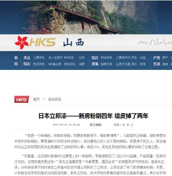 - 2017年3月20日“我是一个粉刷匠,粉刷本领强。我要把那新房子,刷的更漂亮”。儿歌虽然这样唱,但即使是技术很好的粉刷匠,要是遇到不好的涂料也恼火。但这最恼火的人还不是粉刷匠,而是房子的主人。家住福州仓山正祥家园的吴先生就遇到了这样的烦心事。临近315,吴先生将他的烦心事投诉到了记者这里。“你看看,这还能叫做墙吗?这要是人的一张脸呀,早就被毁容了!还以为大品牌,产品质量一定很好才买的,没想到竟然是这样!”吴先生指着家...