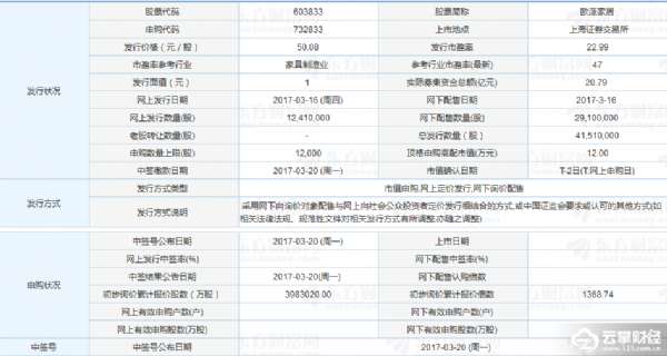 - 2017年3月17日按照监管层安排,在3月16日将会有两支新股进行申购,263理财财富网小编为各位整理了欧派家居股份的申购指南,一起来看看吧!根据监管层安排,欧派家居将于3月16日(周四)在上交所上市申购,股票代码:603833,申购代码:732833,总发行数量4151万股,发行价格:50.08元,单账户申购上限为12000股,发行市盈率22.99倍,以下为欧派家居申购宝典:一、欧派家居投资看点1.公司主营整体厨柜...