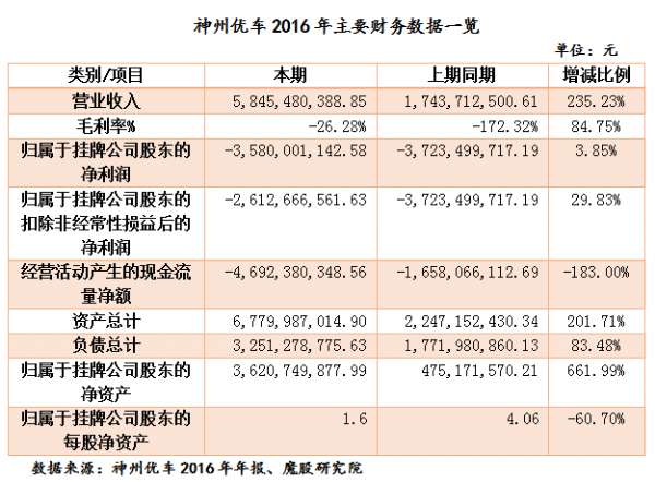 - 2017年3月17日(原标题:神州优车2016年营收58.45亿元业绩亏损35.80亿元)挖贝网讯3月16日消息,神州优车(838006)近日公布的2016年报告显示,截止2016年12月31日,2016年营业收入为58.45亿元,较上年同期增长235.23%;归属于挂牌公司股东的净利润为-35.80亿元,较上年同期-37.23亿元,亏损减少;基本每股收益为-1.68元。截止2016年12月31日,神州优车资产总计为...