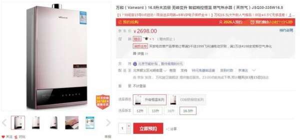 - 2017年3月15日(原标题:大流量才够畅快京东万和定制热水器钜惠)房子大了,家庭成员多了,用水量也变得巨大,经常没热水用是一件很恼人的事,这时候你需要换个热水器了。笔者此次推荐的是万和大流量定制版燃气热水器,京东现价是2698元,15号零点之后会降价到1?98元,最少也会优惠600元。同时还会赠送多用锅,以及8年VIP电子保修金卡。此次活动还参加京东满5000送1999元飞利浦牙刷和满10000元送4198史密斯空...