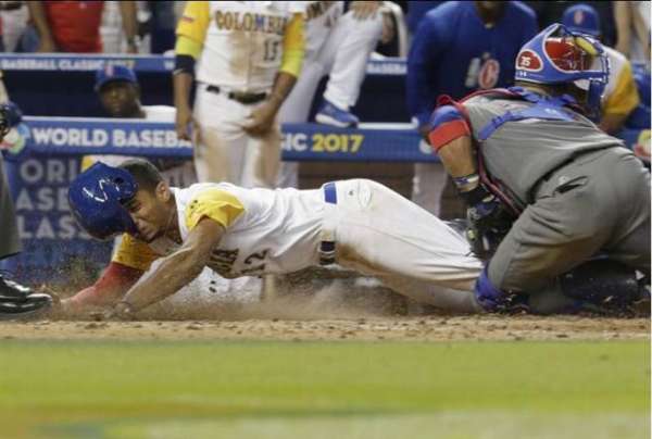 - 2017年3月14日多明尼加捕手卡斯提欧(右)惊险刺杀哥伦比亚跑者马卡多。(美联社)刚在预赛打败美国队,写下经典赛10连胜的多明尼加,碰上首次参加大赛的哥伦比亚却差点翻船!若非外野手包提斯塔(JoseBautista)在9局下直传本垒的双杀成功,上届冠军多明尼加就要栽在哥伦比亚手上。两队以3-3进入延长,打到第11局突破僵局才分出胜负,多明尼加最后仍以10-3大胜,在C组全胜晋级。哥伦比亚教头:差一点就能让全世界惊艷...