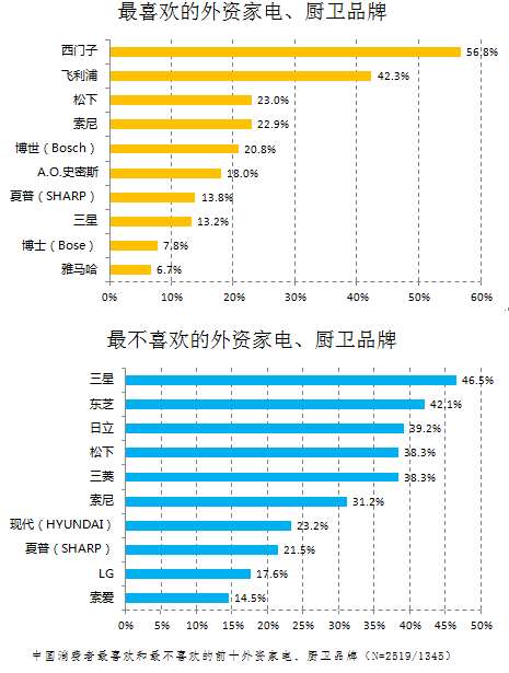 - 2017年3月14日(原标题:外资家电、厨卫品牌好感度排行榜:西门子最具魅力)【环球网综合报道】对于很多中国消费者来说,外资品牌已成为日常消费的一部分。中国人也越来越以更加客观的态度面对这些“舶来品”,而不是一味的推崇。2017年,环球网联合环球时报舆情调查中心就外资品牌相关话题展开网民对外资品牌好感度的调查(调查完整报告)。本次调查于2017年2月20日-2月26日通过环球网、一点资讯、UC、百度、凤凰、搜狐和今日...