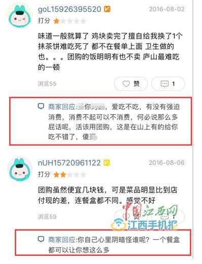 - 2017年3月14日例如顾客说服务员态度特别差,商家回复:“X你妈X,爱吃不吃,有没有强迫消费,消费不起可以直说,活该用团购,这是在山上有的给你吃不错了,傻X。”言辞激烈。有顾客评论说口味不怎么样,商家回复:“嘴巴这么叼,我们也是无语了。”还有顾客评论道食物中有头发,感觉恶心,商家回复:“很正常啊,会和员工强调注意一下。”商家:仍正常营业电话无法接通2月4日,中国江西网记者按照美团上提示的电话致电该商家,语音提示电话...