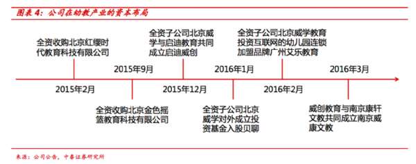 - 2017年3月12日编者按:从2015年2月收购红缨教育开始,威创股份已经多次在幼教行业出手。包括红缨教育、金色摇篮、贝聊等。在连续投资并购之后,威创股份在幼教行业的布局有了雏形。在中泰证劵有限公司这份关于威创股份的研报中,介绍了红缨教育、金色摇篮被收购后的发展情况,以及威创股份下一步的发展规划。以下为研报内容(有删减):自2014年和君系开始进入公司,对威创股份的累积持股比例已经接近15%,在和君不断为公司导入和输...