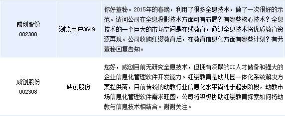 - 2017年3月12日全景网2月26日讯威创股份(002308,股吧)(002308)周四在全景网互动平台表示,公司拥有深厚的IT人才储备和强大的企业信息化管理软件开发能力。子公司红缨教育是幼儿园一体化系统解决方案提供商,目前传统的幼教行业信息化水平尚处于起步阶段,幼教市场信息化管理软件需求旺盛,公司将积极协助红缨教育探索如何将幼教与信息技术相结合。公司2月3日发布公告称,公司拟以5.2亿元收购北京红缨时代教育科技有限...