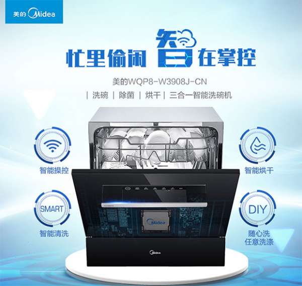 - 2017年3月9日>>科技买手,全网尖儿货打折/特卖推荐平台<<美的(Midea)WQP8-W3908J-CN嵌入式家用洗碗机,8套餐具大容量,WiFi智控洗,全智能除菌烘干,日前京东超级品类日预约,绝对优惠价抢购。智能判断餐具脏污程度,自动匹配洗涤模式,让洗碗更简单;连接智能微连APP,手机远程遥控,随时随地掌控洗碗状态,选择程序,进行智能洗碗,同时水耗、能耗用量也能查看,体验多种吸毒乐趣。中式洗涤系统,双层刀锋...