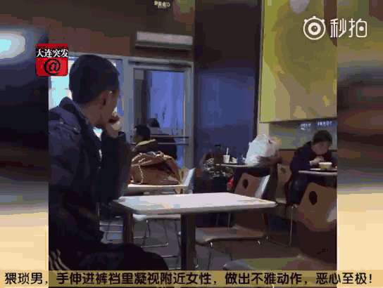 - 2017年3月8日3月5日,大连网友爆料,在大连火车站附近的一家KFC肯德基内惊现一名猥琐小伙,小伙身着阿迪黑色运动裤和运动鞋,将手伸进自己裤裆凝视附近女性,做不雅动作。网友分析,小伙看起来精神不像有问题,有人路过他就停,观察后又继续。视频小时,小伙不停地用自己右手上下拨动,寻求刺激。左手则放在桌子上遮挡。生活君提醒,天气转暖,女性请注意防范!...